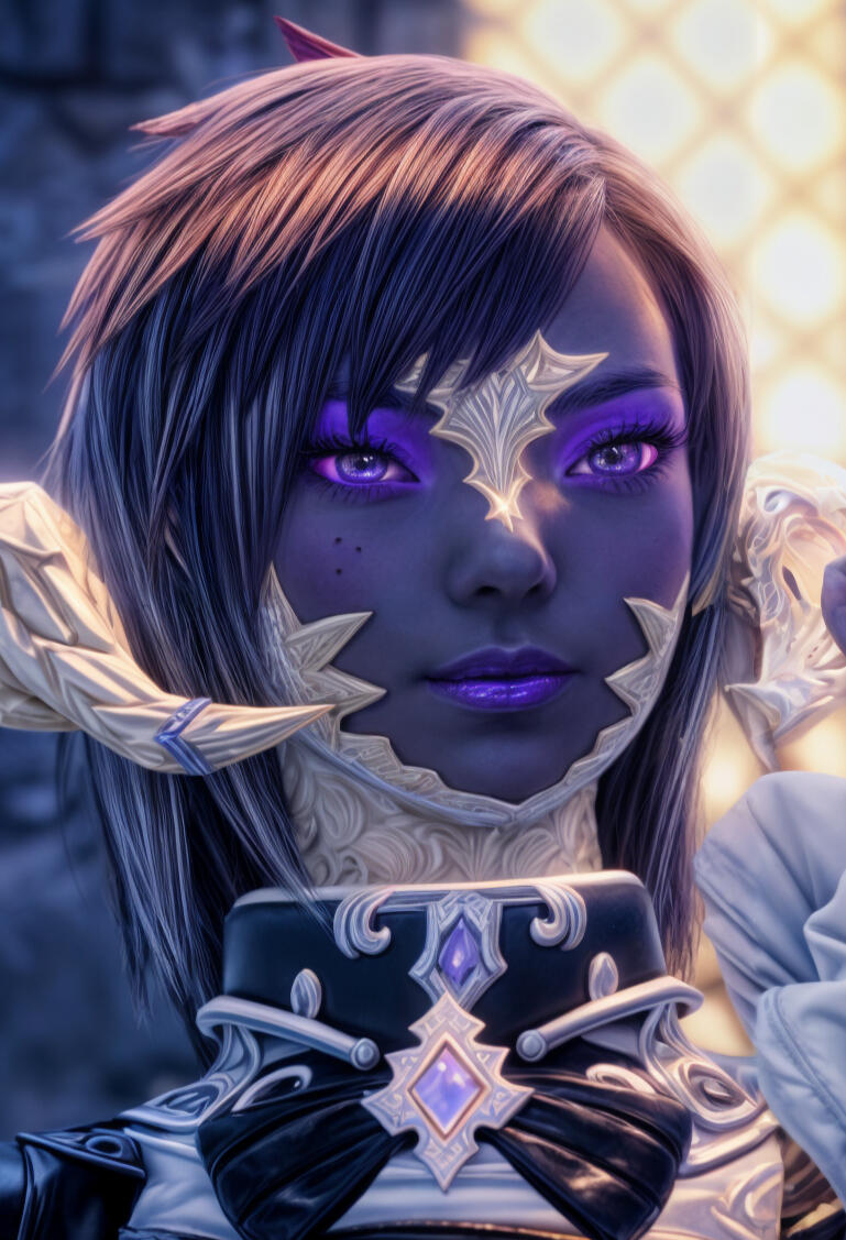 | Haarfarbe | violett (knochenweiße Strähnen) |